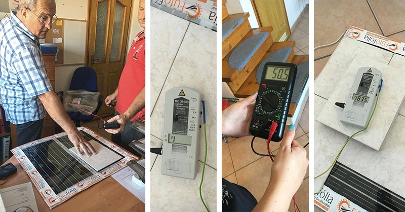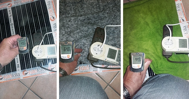 A fólia csatlakoztatása a forgalmazó által előzetesen rászerelt kábellel történhet; kéteres kábel, földelés nélküli villásdugó. Ebből arra lehet következtetni, hogy kettős szigetelésű a termék, és árnyékolásra sincsen szükség. A padlóra fektetett fólia felületi hőmérséklete az aktív rétegen mérve 49 °C. Az aljzat padlócsempe, hasonló hőtechnikai tulajdonságokkal, mintha betonba lenne ágyazva a fólia. A 0,5×0,5 m-es fólia teljesítményfelvétele 109,3 W. Stimmel, a gyári adat 110 W/méter, vagy mégsem, hiszen ez csak 50 cm a tekercsből! A pulóverrel teljesen letakart felület hőmérséklete 64,8 °C-ra emelkedett, a teljesítményfelvétel 102,4 W. A hőmérsékletemelkedés mértéke 24,4%, míg a teljesítményfelvétel csökkenése mindössze 6,3%.