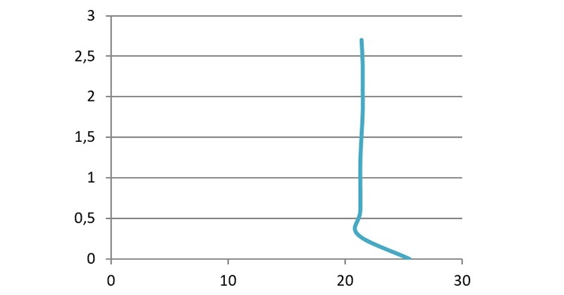 Az 1. ábrán egy korábbi mérésünk látható egy padlófűtéses szobában, ahol a födém a fűtetlen padláshoz kapcsolódik. A mérés függőlegesen, 30 centiméterenként történt. A legalsó pont maga a fűtött padló, a legfelső a fűtetlen födém. Érdekes megfigyelni, hogy a födém hőmérséklete éppen megegyezik az alatta lévő levegőrétegével, annak ellenére, hogy hűlő felületről van szó, tehát hidegebbnek kellene lennie, mint az alatta lévő levegőrétegeknek. Ez akkor lenne igaz, ha a feláramló levegő fűtené a födémet, de nem, itt sugárzó fűtés zajlik teljes egészében, vagyis a padló napként „süti” a mennyezet felületét.