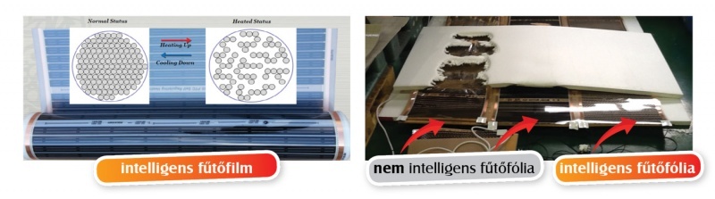 A fenti képen 2 különböző fűtőfólia látszik. A jobb oldali az intelligens fűtőfólia, ahol a szigetelő anyag ráhelyezését követően a termék „visszavette” a teljesítményt, így elkerülte a lehetséges balesetet ezzel.